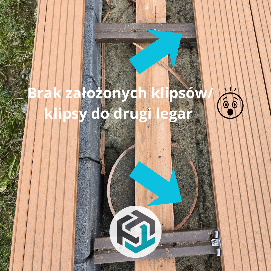 Pierwszą rzeczą, która rzucała się w oczy, był błędny system montażu. Klipsy montażowe nie były zamocowane do legarów zgodnie z zasadami, lecz pojawiały się co drugą deskę. Taki montaż powoduje brak stabilności konstrukcji, pracę desek oraz ich szybsze zużycie.