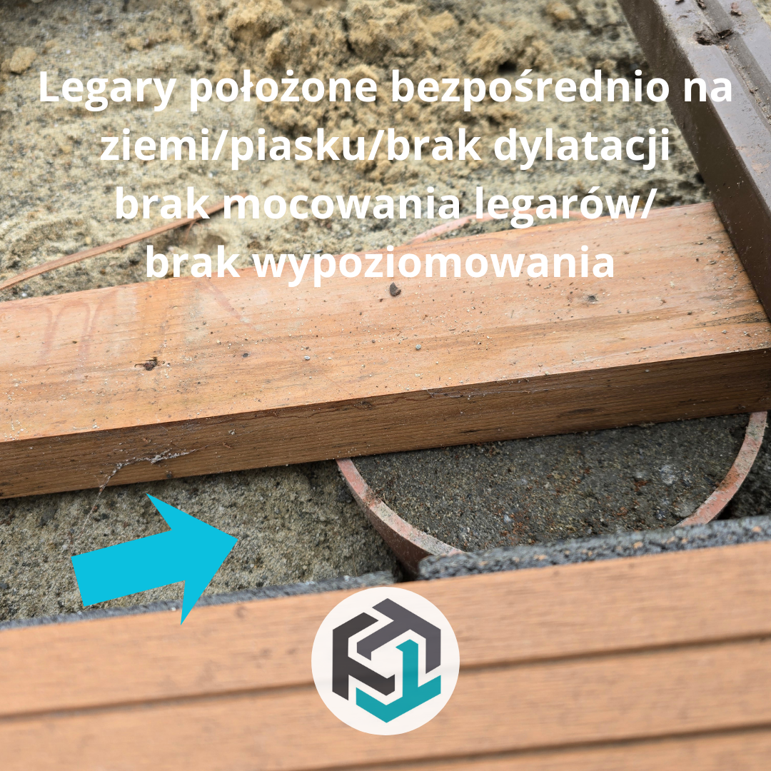 Główne legary zostały ułożone bezpośrednio na gruncie, bez żadnej dylatacji i podkładek. Oznaczało to stały kontakt z:
