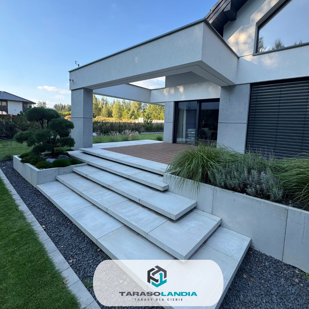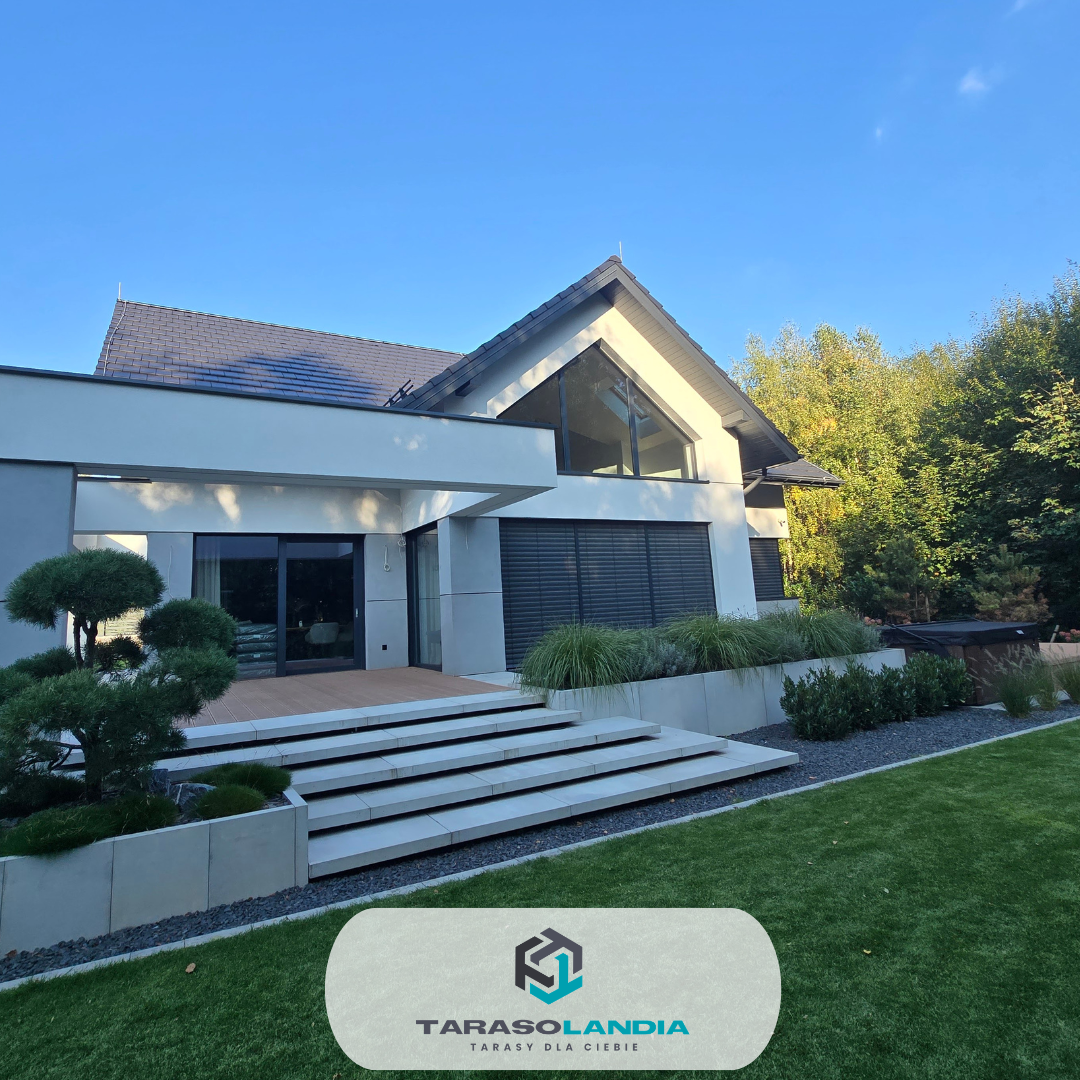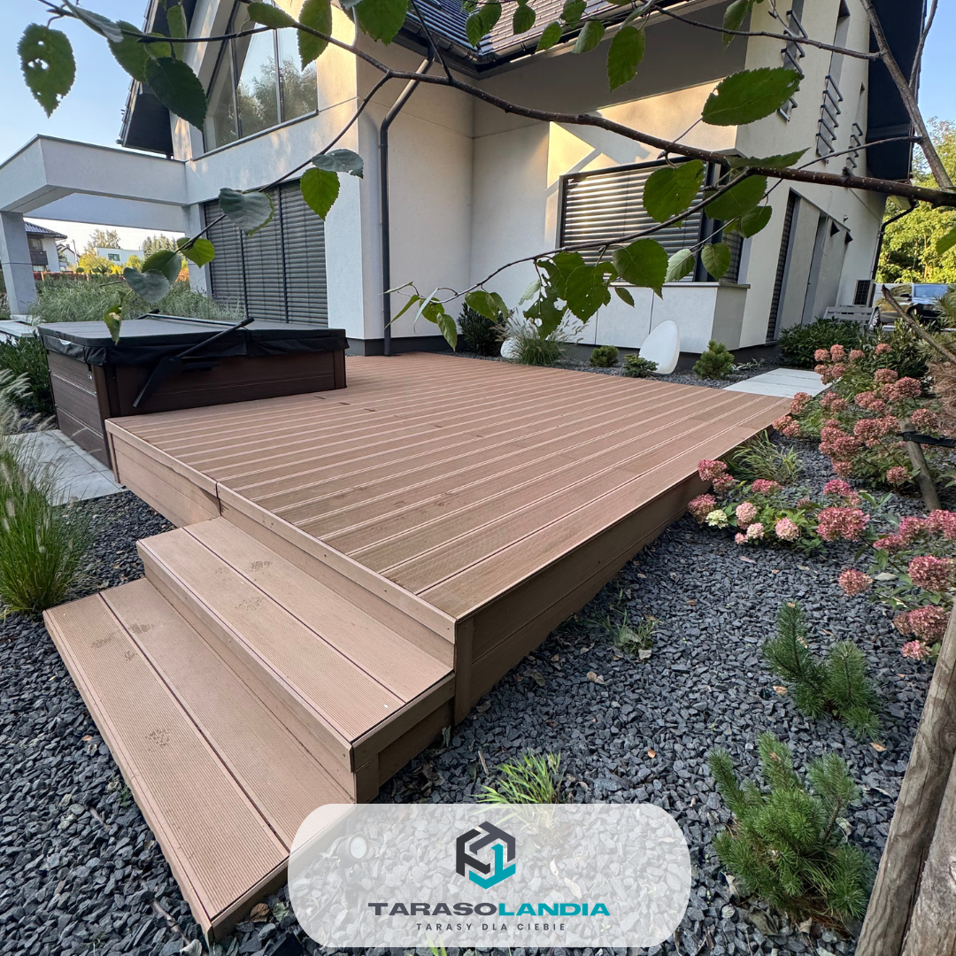 Tarasy zostały estetycznie obudowane płytami betonowymi, które wykonała firma brukarska. Całość uzupełniają nowoczesne donice ogrodowe, które nadają przestrzeni elegancki charakter. Dodatkowym elementem realizacji była również zabudowa jacuzzi z deski kompozytowej Twinson, dzięki czemu strefa relaksu została spójnie połączona z całą konstrukcją tarasu.